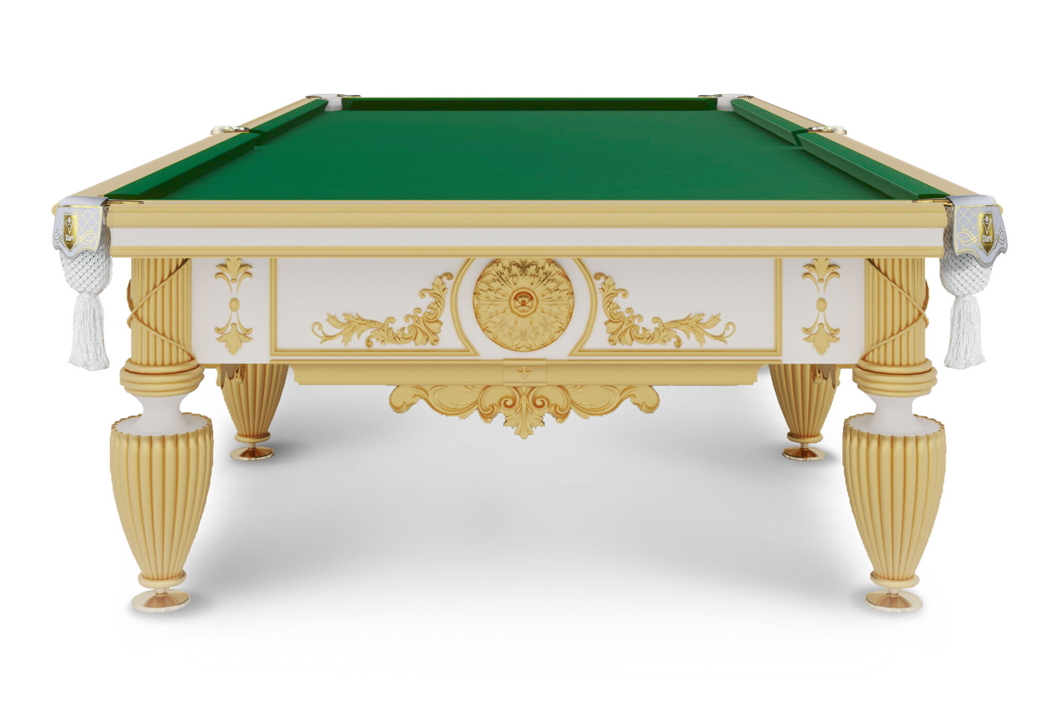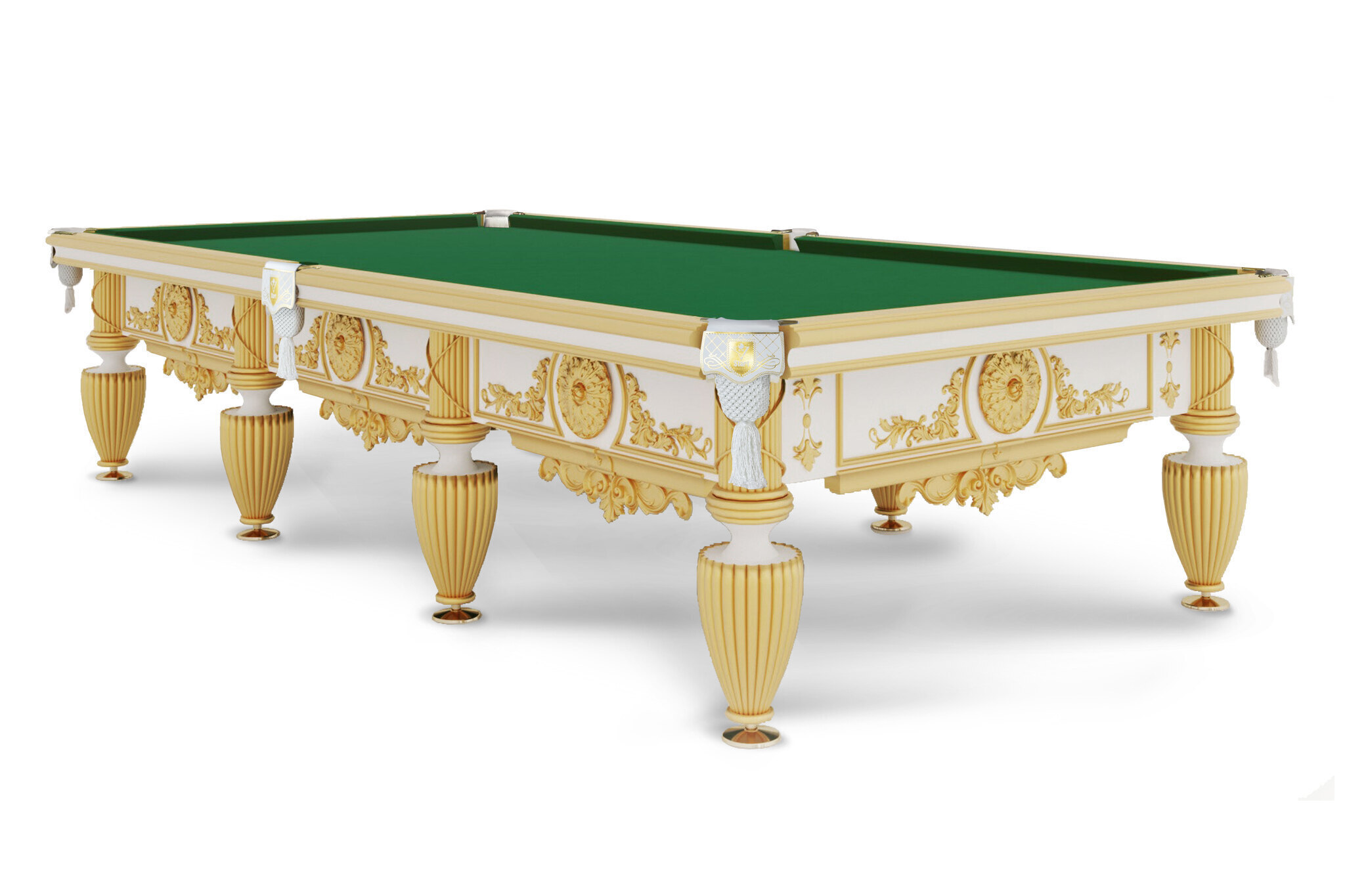 Стол эксклюзивного уровня выполнен из граба и собран из лучших комплектующих. Шульцевское крепление ног гарантирует максимальную устойчивость конструкции. В основе игрового поля — натуральный сланец Orero толщиной 45 мм. Профессиональные амортизаторы бортов Start Super Pro надолго обеспечит отличный отскок шара. В стандартную комплектацию входит сукно с высокими эксплуатационными характеристиками бренда Manchester. Авторская Выкраска стола выполнена в авторской технике с применением золотой потали.
