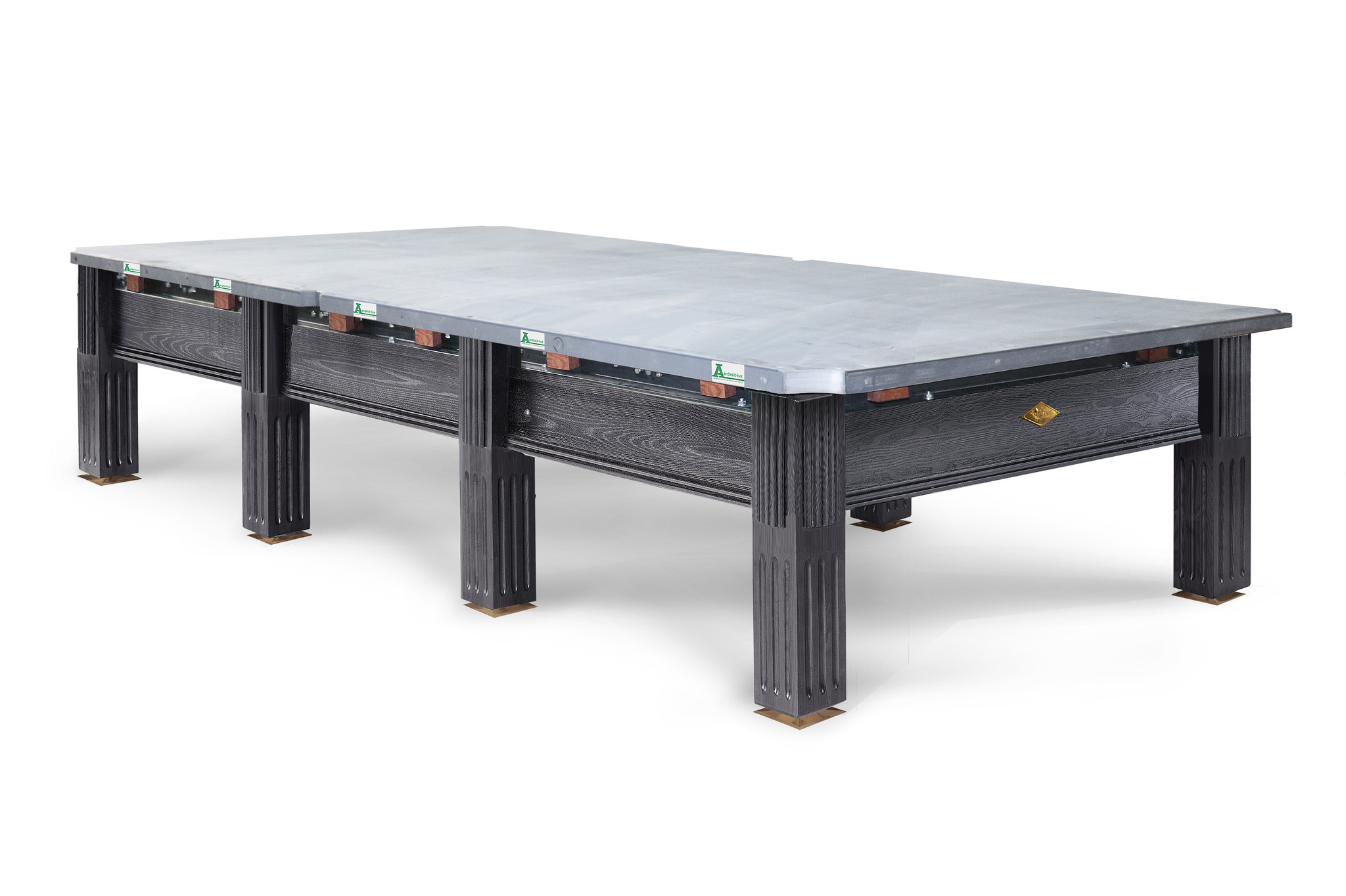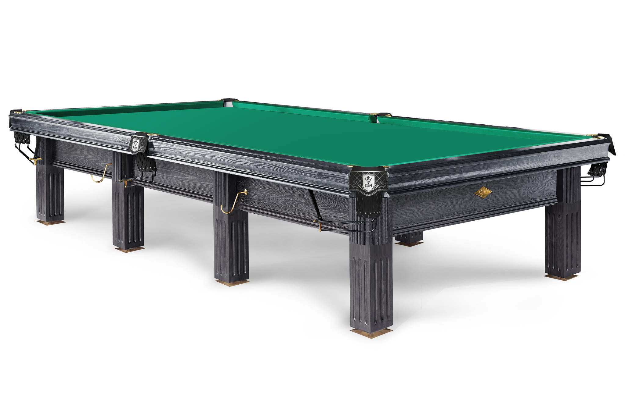 Модель также усовершенствована усиленным крепежом, в изготовлении используется исключительно массив дерева и лузы из натуральной кожи . На столе такого уровня используются только латунные скобы на лузы и латунные чашки опор, лучшее сукно Manchester 70 wool Yellow green competition и амортизаторы Start Super Pro, рекомендованные ФБСР для проведения чемпионатов.