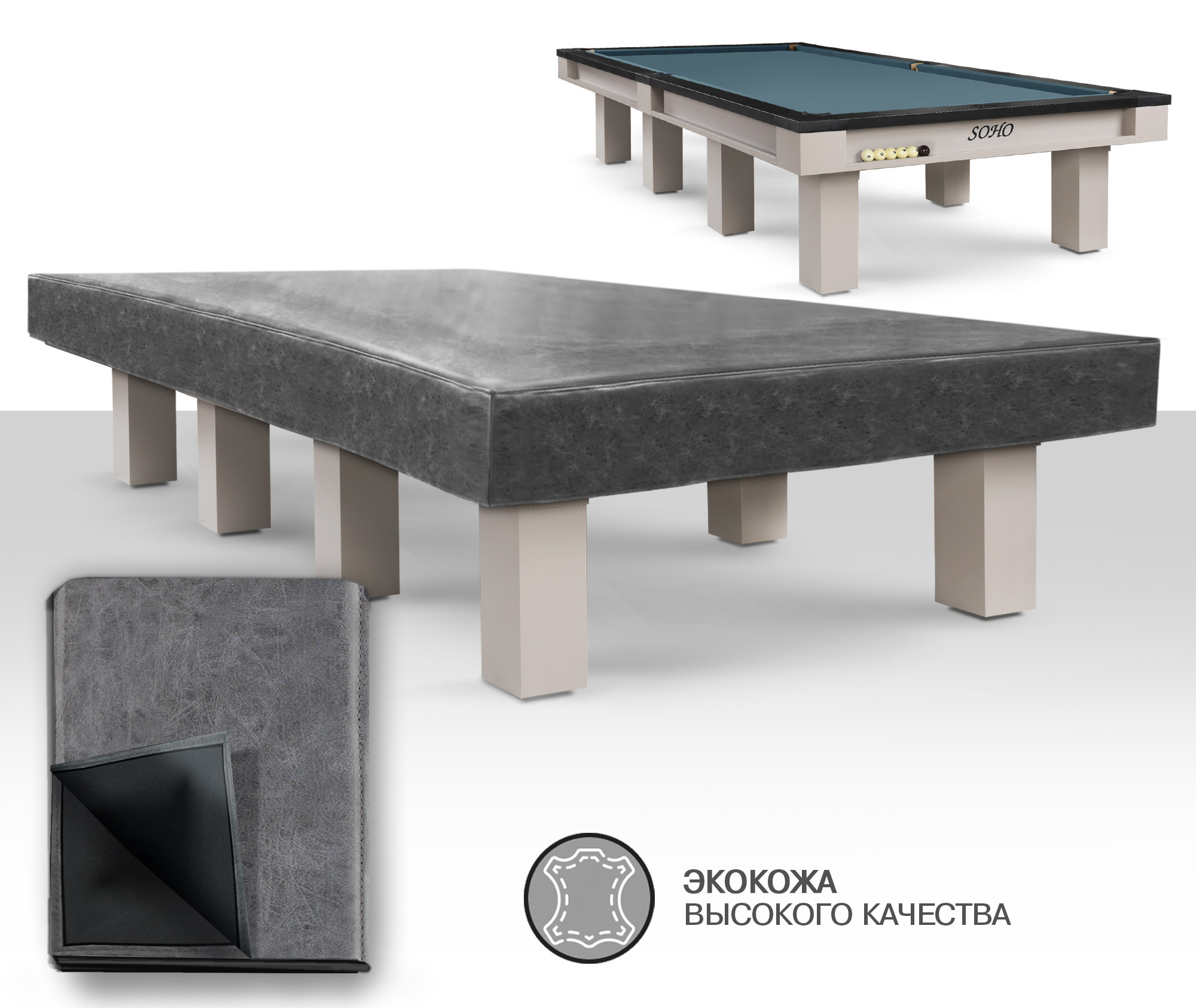 Чехол для бильярдных столов из плотной экокожи высокого качества обеспечивает надежную защиту от пыли, влаги, солнечного света и случайных царапин в перерывах между играми. Благодаря этому чехлу сукно не выгорает на солнце, и необходимость частой чистки поверхности стола от пыли значительно уменьшается. Это позволяет сукну сохранять свои свойства на более длительный срок. Чехол представляет собой идеальное сочетание стиля и функциональности. Специально разработанный для бильярдного стола SOHO чехол обеспечивает идеальную защиту поверхности, надежно закрывая борта и лузы. Также одним из главных достоинств данного чехла является его стильный и элегантный дизайн. Он способен подчеркнуть изысканный вкус владельца, добавляя нотку утонченности в обстановку. Чехлы представлены в двух классических цветах: бежевый и серый. Это универсальные цвета, которые легко впишутся в любой стиль интерьера. Такой чехол станет гармоничным дополнением к интерьеру любой бильярдной комнаты, создавая атмосферу уюта и роскоши. Материал чехла не требует особого ухода. Достаточно периодически аккуратно очищать от пыли влажной тканью, что делает его использование еще более удобным. Чехол станет незаменимым аксессуаром для любого владельца бильярдного стола, обеспечивая не только защиту, но и добавляя эстетическую привлекательность вашему игровому пространству.