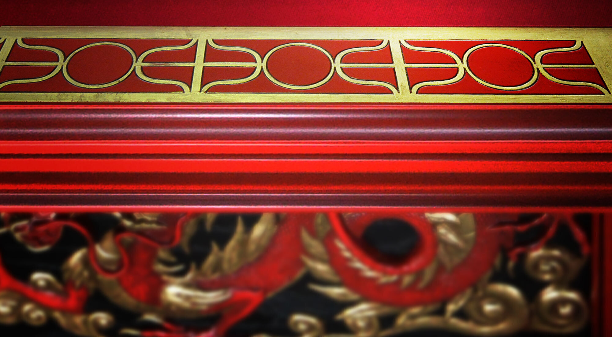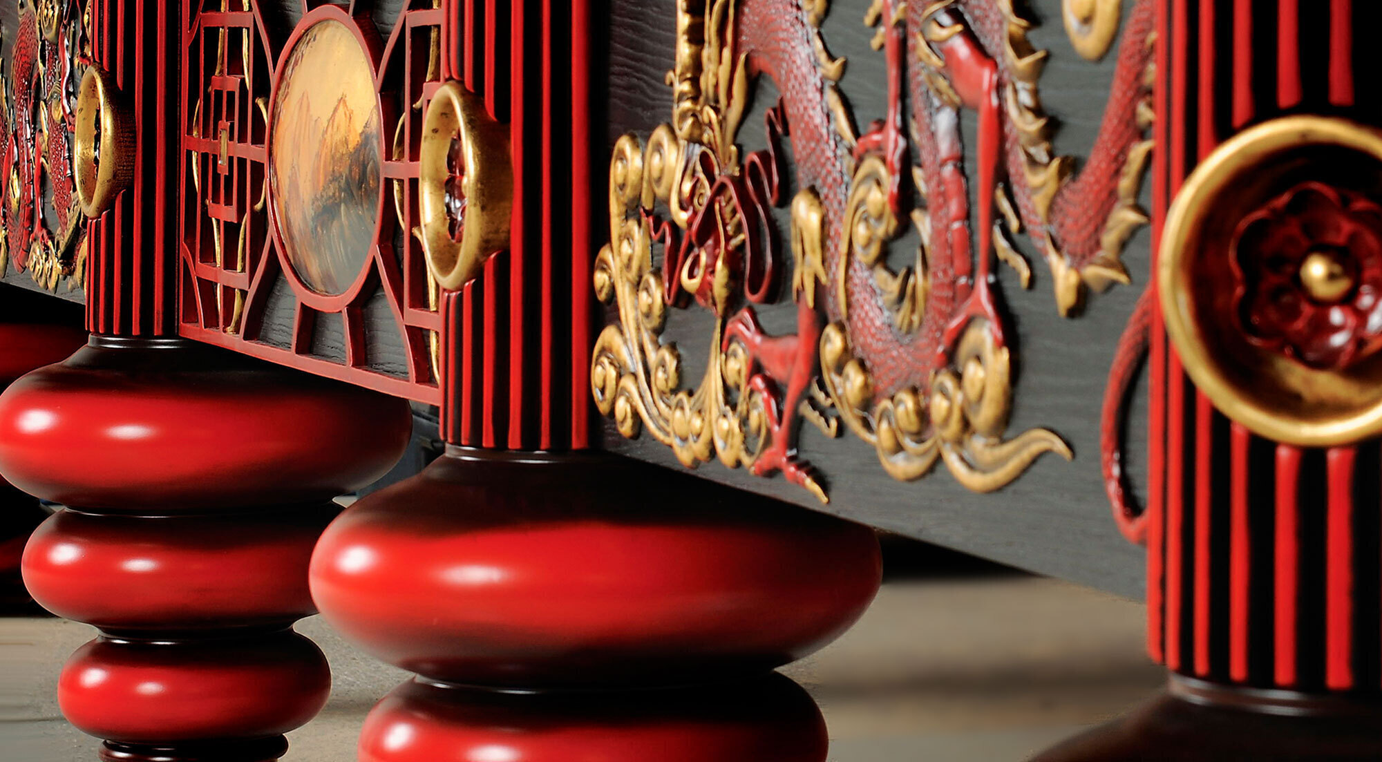 Китайский императорский стиль стал главным ориентиром при разработке образа стола. Лафет украшают золоченые барельефы драконов и декоративное панно традиционной китайской росписи - выполняется мастерами вручную специальными минеральными красками. Отделка стола «Дракон» подобрана с учетом традиций старинных технологий. Лаковая многослойность на бортах: 10 слоев лака применена для достижения глубины, насыщенности, многогранности цвета. Брашированное дерево: дерево с душой на лафете, для дополнительного рельефа и графичности волокна. Конструкция стола «Дракон» вобрала в себя все лучшие технологические разработки Фабрики. Эксклюзивная металлическая несущая рама, интегрированная в основание стола, обеспечивает непревзойденную устойчивость и статичность всей конструкции стола. Система плавающих гаек в вертикальном креплении бортов идеальным образом крепит борт к плите, благодаря чему борт и плита становятся единым монолитом.