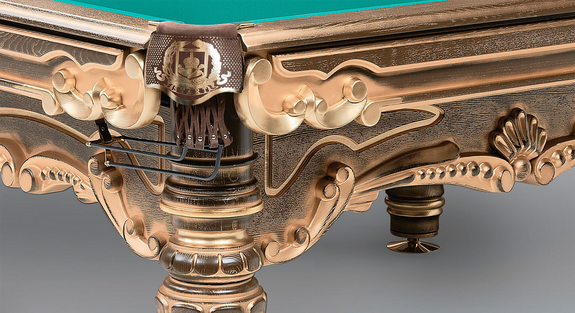 Бильярдный стол «Император Голд» поистине уникален. Натуральный массив клена, резные элементы, неповторимый дизайн лафета и ног. Шикарная отделка всей поверхности стола и аксессуаров золотой пастой и сусальным золотом в 23 карата, а также специальная технология искусственного старения древесины делают стол «Император Голд» настоящим произведением искусства.