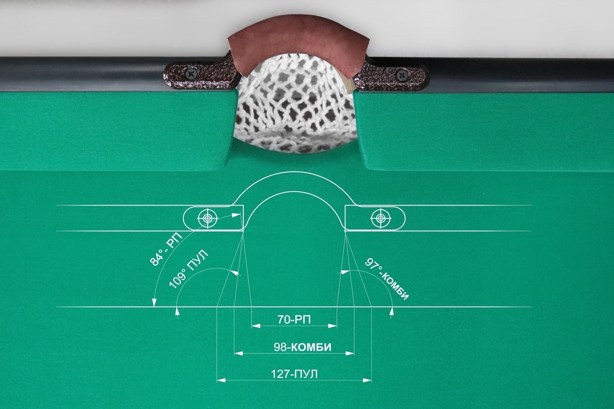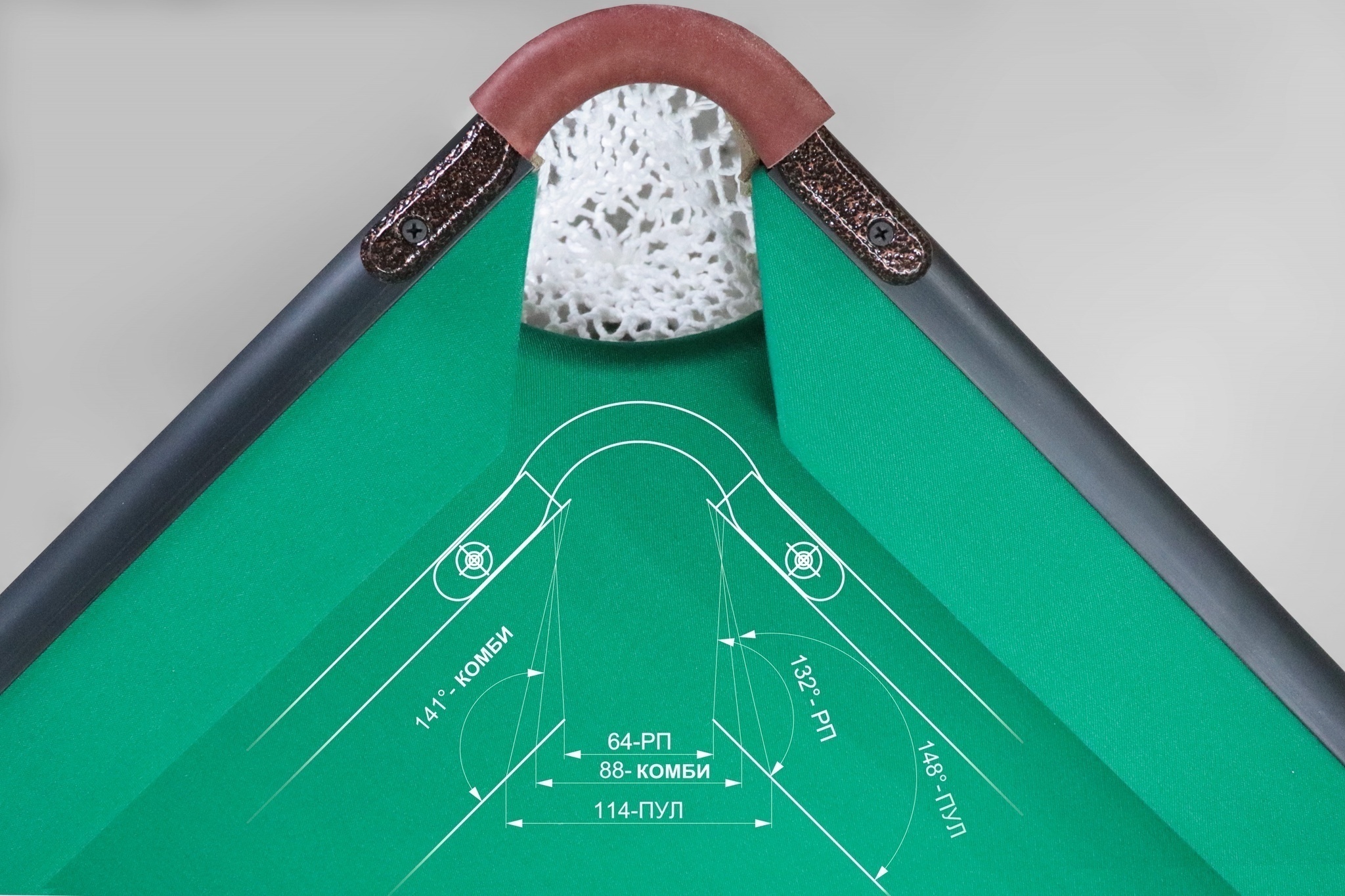 Особенностью стола являются створы луз, они универсальны и адаптированы под оба типа игры. Размер створа средней лузы – 98 мм, угловой – 88 мм. На таком столе комфортно играть шарами и для Пирамиды, и для Пула. Не искажая смысла и сути игры, стол «Кадет Комби» сохраняет специфику как Русской пирамиды, так Американского пула.