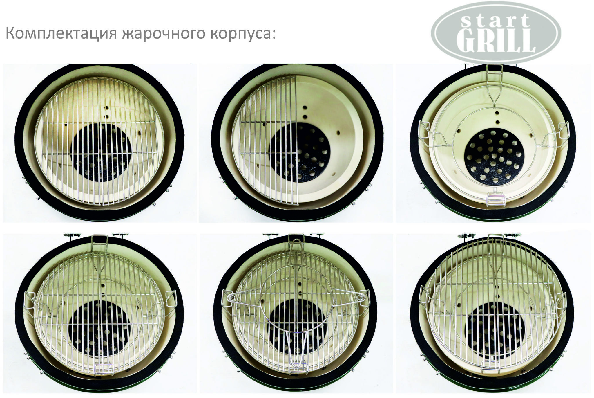 Керамический гриль со стеклянным окошком Start Grill 22. Модель одновременно сочетает в себе функции гриля, барбекю, мангала, коптильни, духовки, печи для пиццы и тандыра. Гриль выполнен из экологически чистой толстостенной керамики и очень прост в использовании, потребуется совсем немного времени, чтобы подготовить его к работе и начать готовить настоящие кулинарные шедевры. Керамические грили Start Grill – идеальное соотношение цены, качества и функционала. При производстве гриля Start Grill используются самые прочные и долговечные материалы, которые не боятся ни коррозии, ни перепадов температур и позволяют сохранить презентабельный вид изделия на многие годы. Перед сборкой гриля ознакомьтесь с инструкцией, которая входит в комплектацию модели, а также следуйте всем правилам эксплуатации.