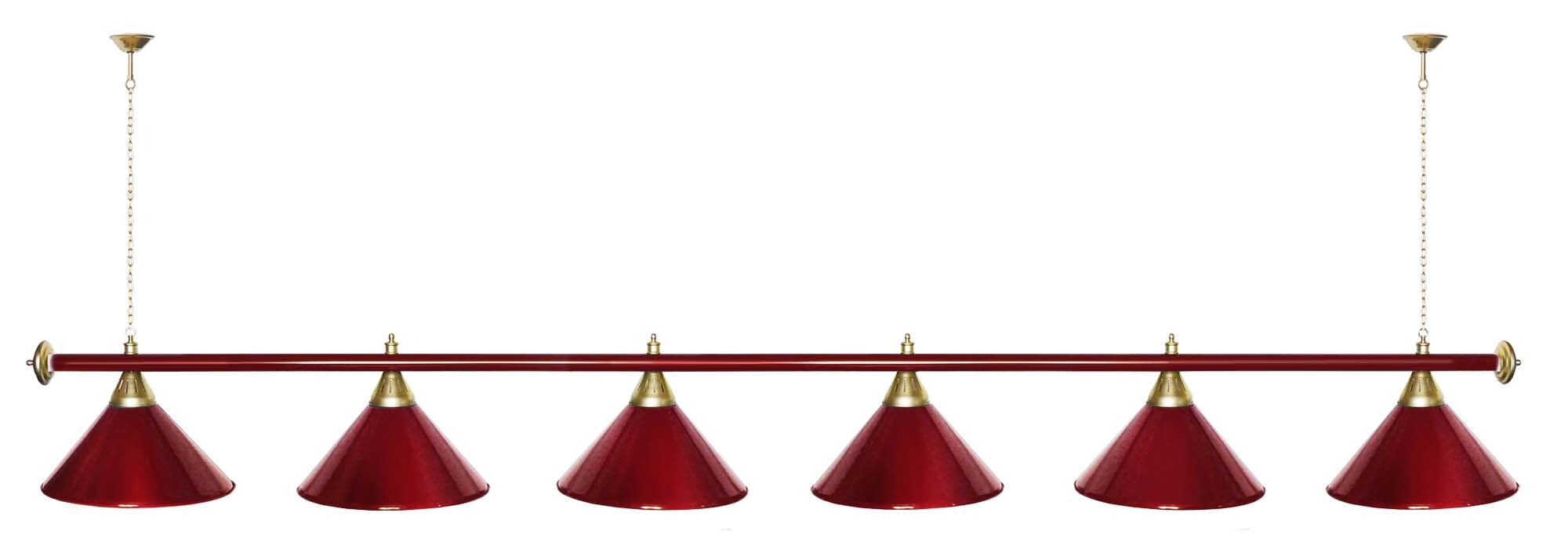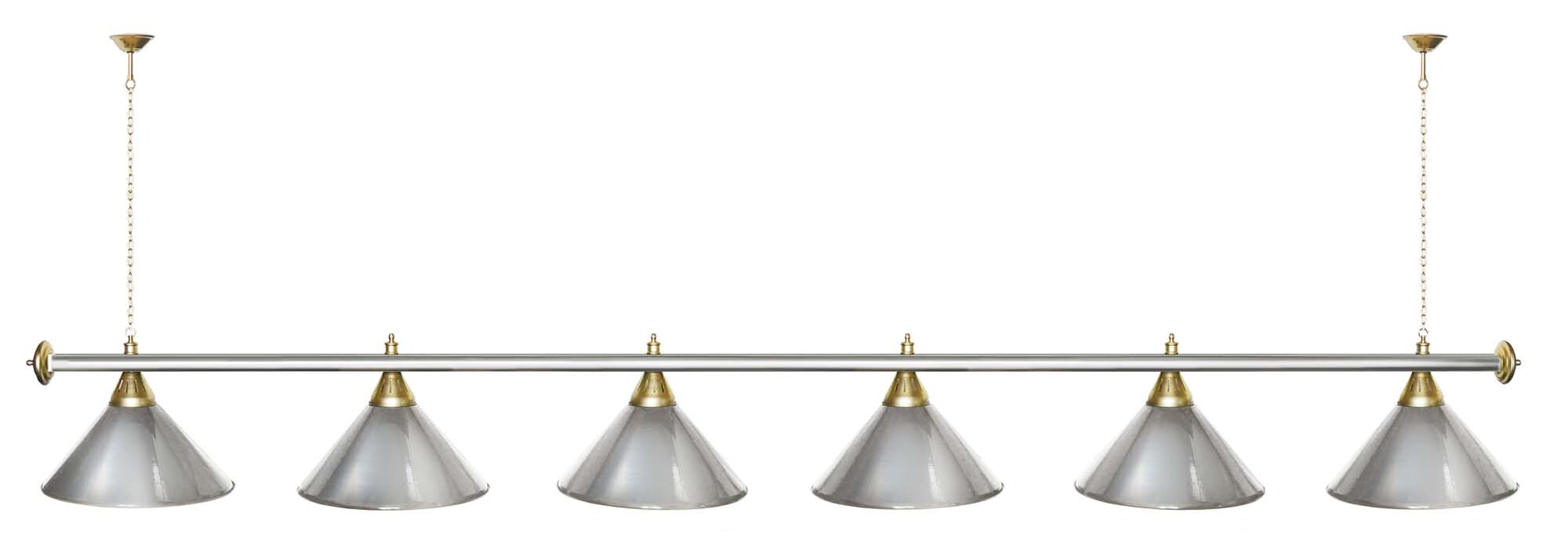Светильники Startbilliards производства ФС «Горизонт» с 6-ю плафонами комплектуются к столам 12 футов. Укомплектованы цельной металлической штангой с полимерным покрытием. Штанга изготовлена из цельной трубы, что исключает искривление конструкции. Применение керамических патронов #40;Е27#41; увеличивает срок эксплуатации светильника. Металлические плафоны крепятся с помощью зажимных пластин. Длина подвесной цепи 100 см — оптимальное расстояние для расположения источника света над игровым полем стола. В комплект включены две потолочные чашки. Условные схематические обозначения: Н — общая высота светильника / 1420 мм L — общая длина светильника / 2920 мм D — высота плафона / 300 мм d — диаметр плафона / 370 мм C — расстояние между осями / 500 мм Штанга и плафоны поставляются в отдельных упаковках.