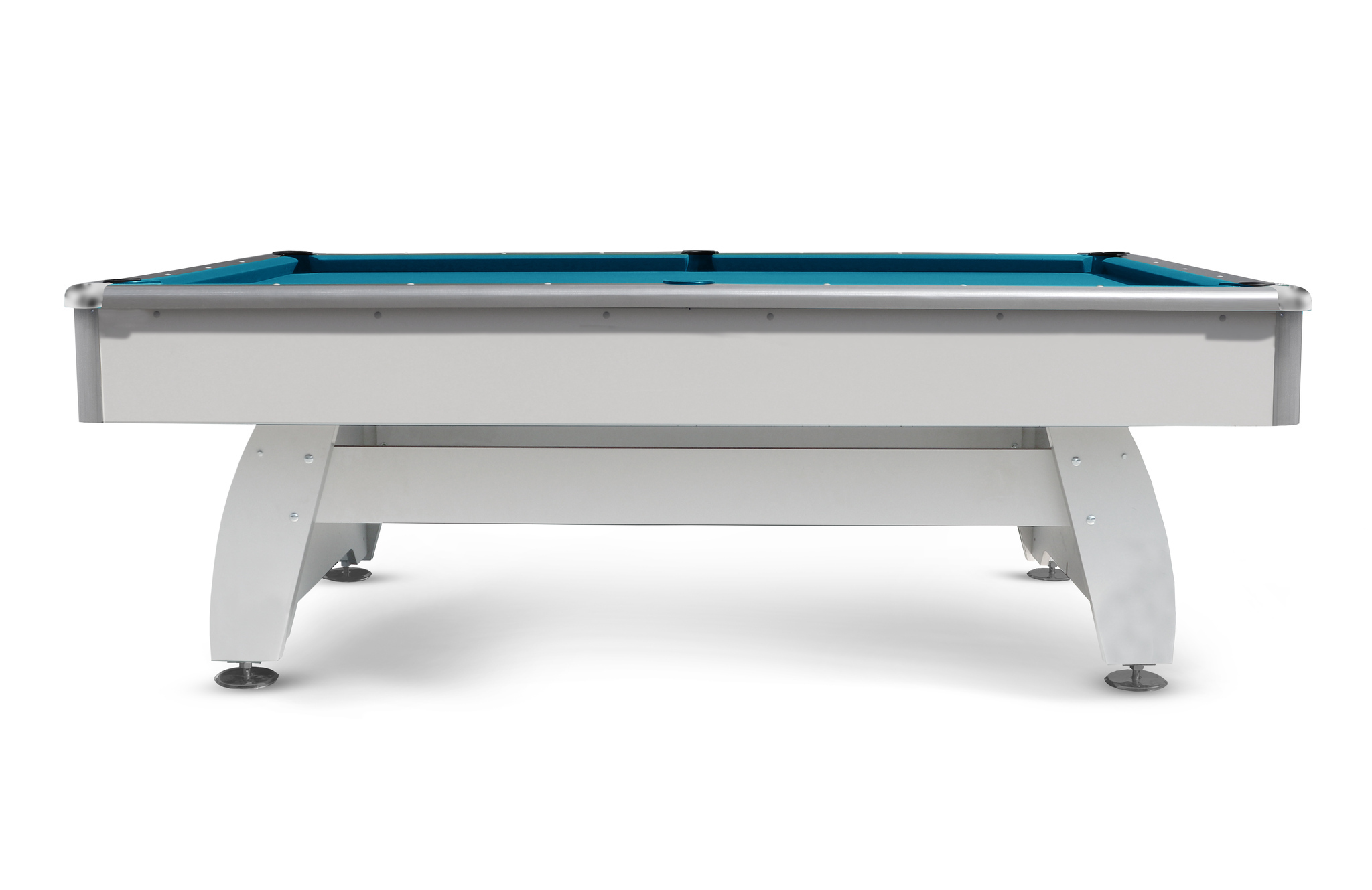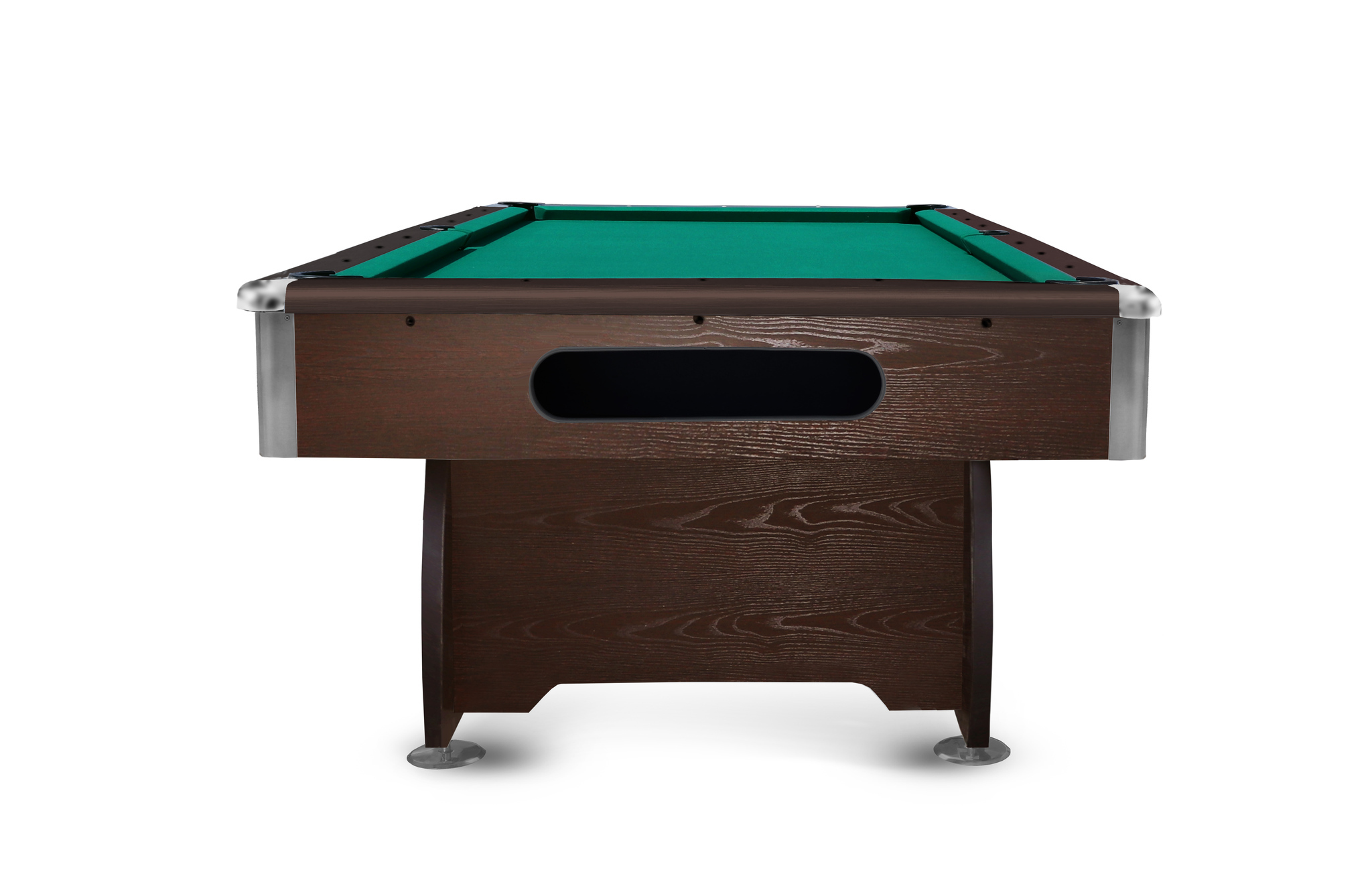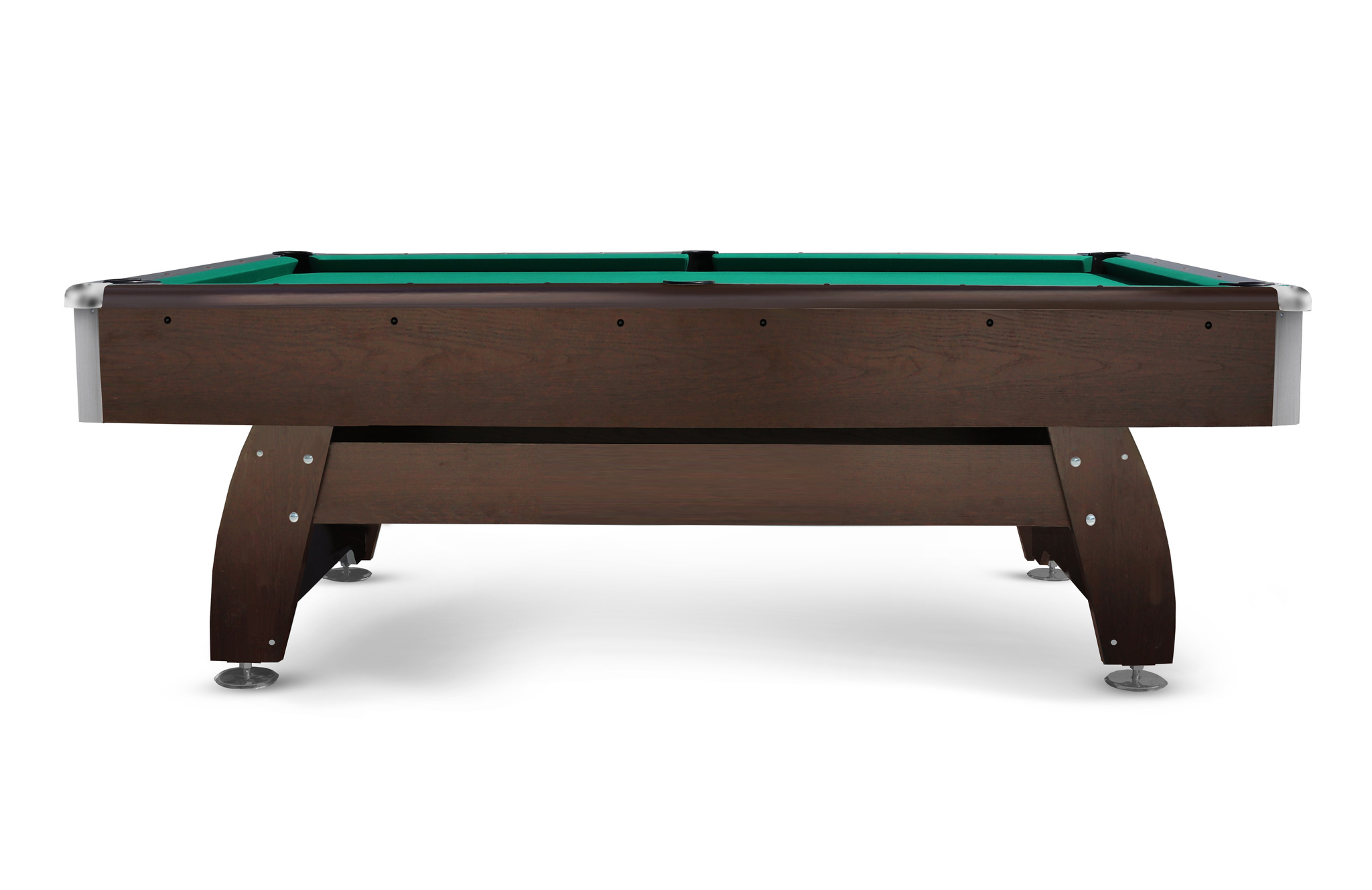 Конструкция стола выполнена из МДФ и ЛДСП, оснащена основательным лафетом, имеет усиленную несущею раму, повышенную статичность и жесткость, максимально приближенную к профессиональному уровню. Модель с системой ската шаров. Основа игрового поля может комплектоваться натуральным сланцем, камнем PBS или камнем Super Stone.