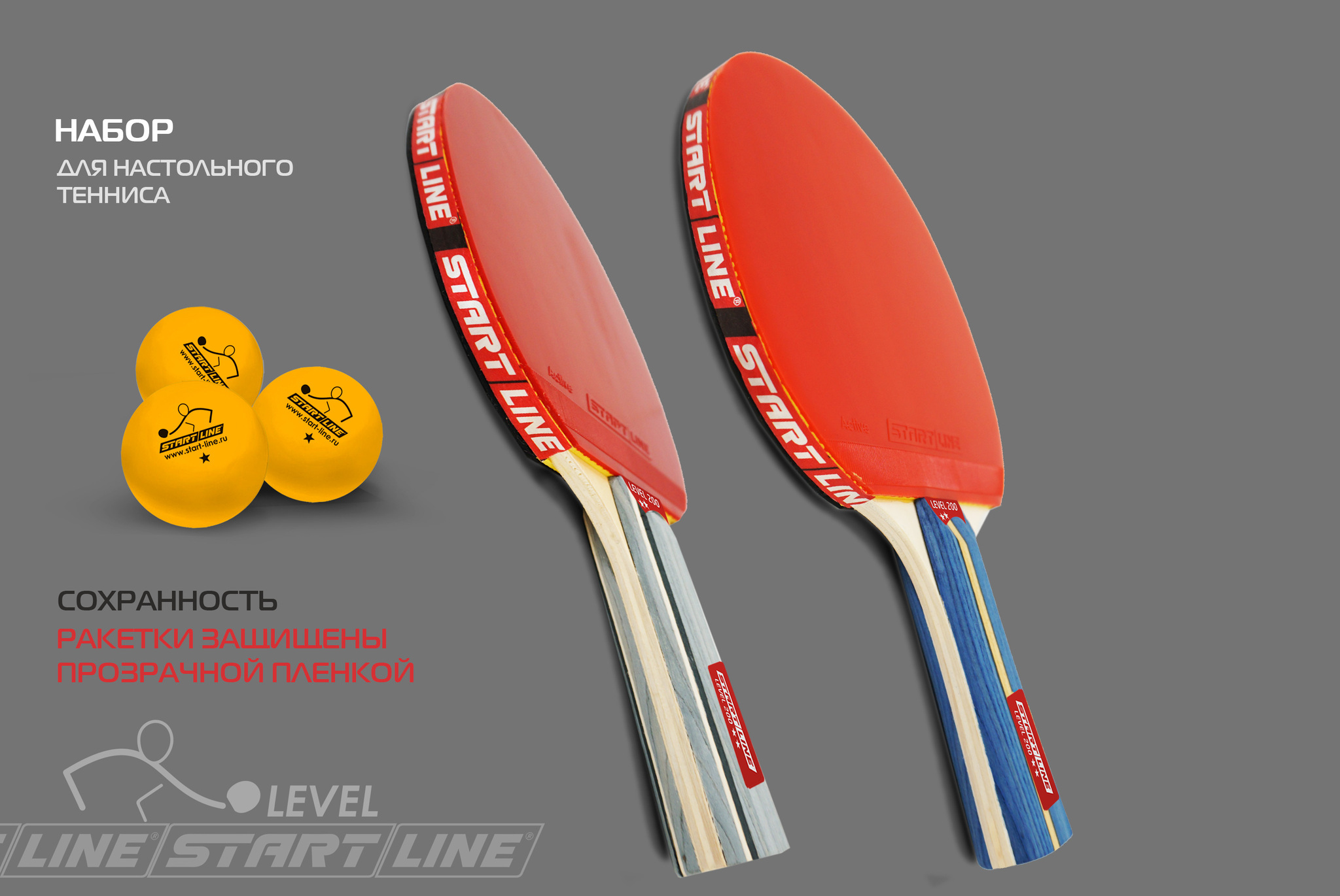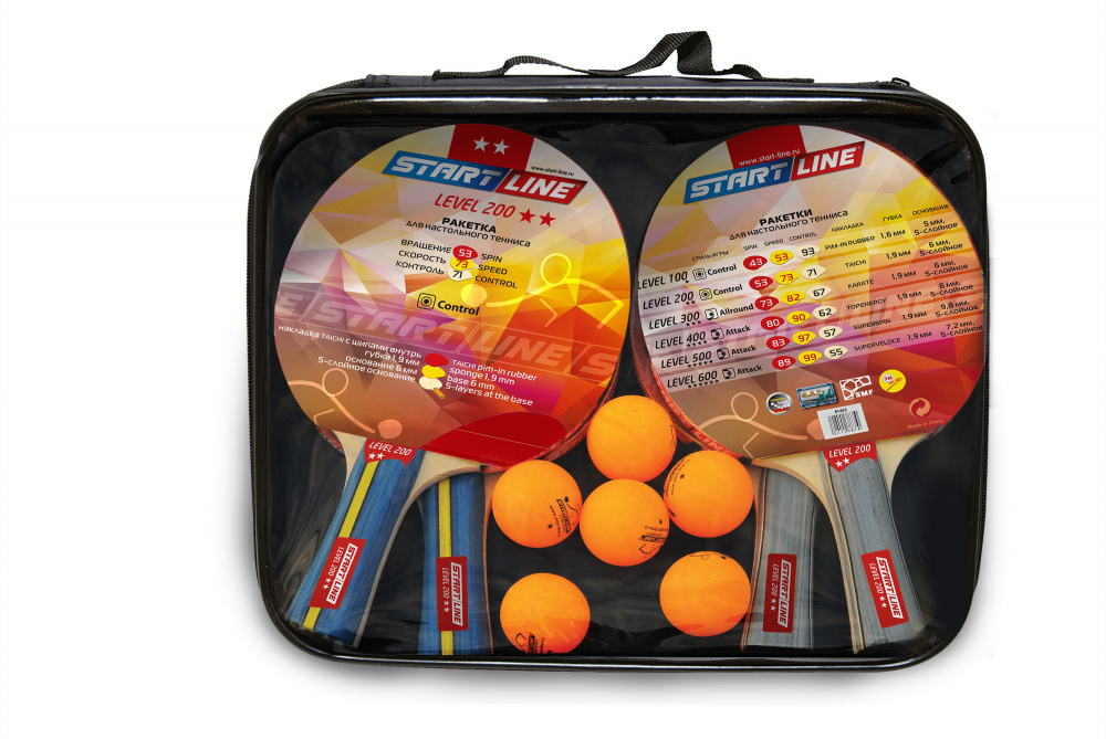 Набор START LINE: 4 Ракетки Level 200, 6 Мячей Club Select, упаковано в сумку на молнии с ручкой.