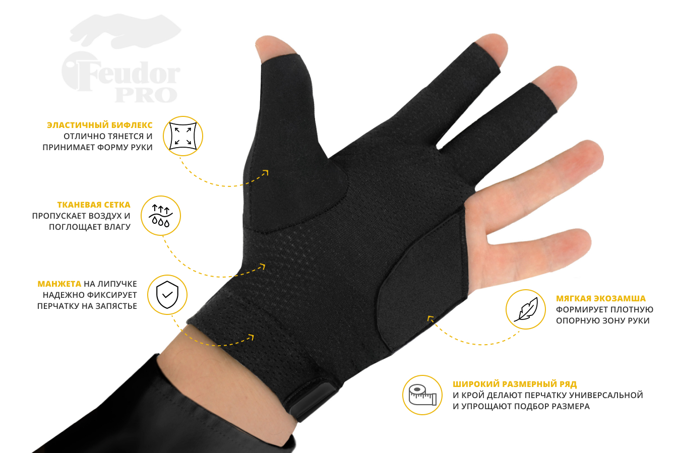 Высококачественные материалы делают перчатку Feudor Pro black максимально комфортной. Ее использование позволяет обойтись без талька для рук, обеспечивает плавное скольжение кия и повышает точность удара даже в самые напряженные моменты игры. Перчатка плотно прилегает к коже и отлично сидит на руке, что позволяет игроку максимально чувствовать кий и дарит самые яркие эмоции от игры. Благодаря манжете перчатка Feudor Pro black надежно фиксируется на запястье, обеспечивая стабильность и уверенность при каждом ударе.