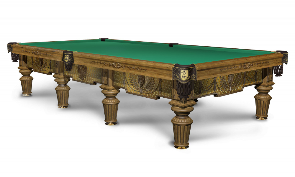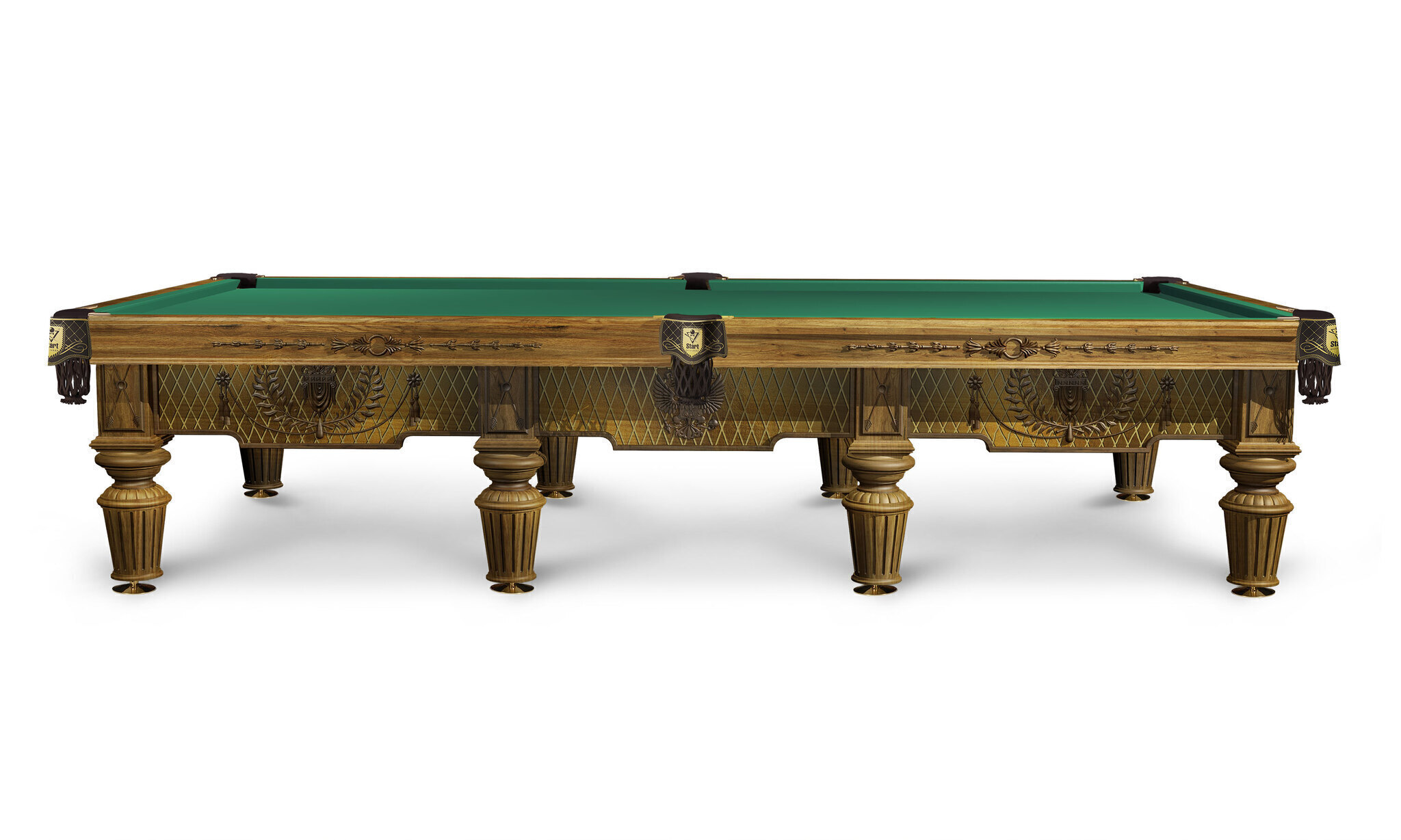Бильярд с ручной резьбой на лафете изготовлен из отборного массива ясеня, в основание встроена эксклюзивная металлическая рама, придающая конструкции бильярда непревзойденную устойчивость. Сложная выкраска и тонирование включает слой покрытия смолой, поэтому поверхность имеет своеобразный 3D эффект.