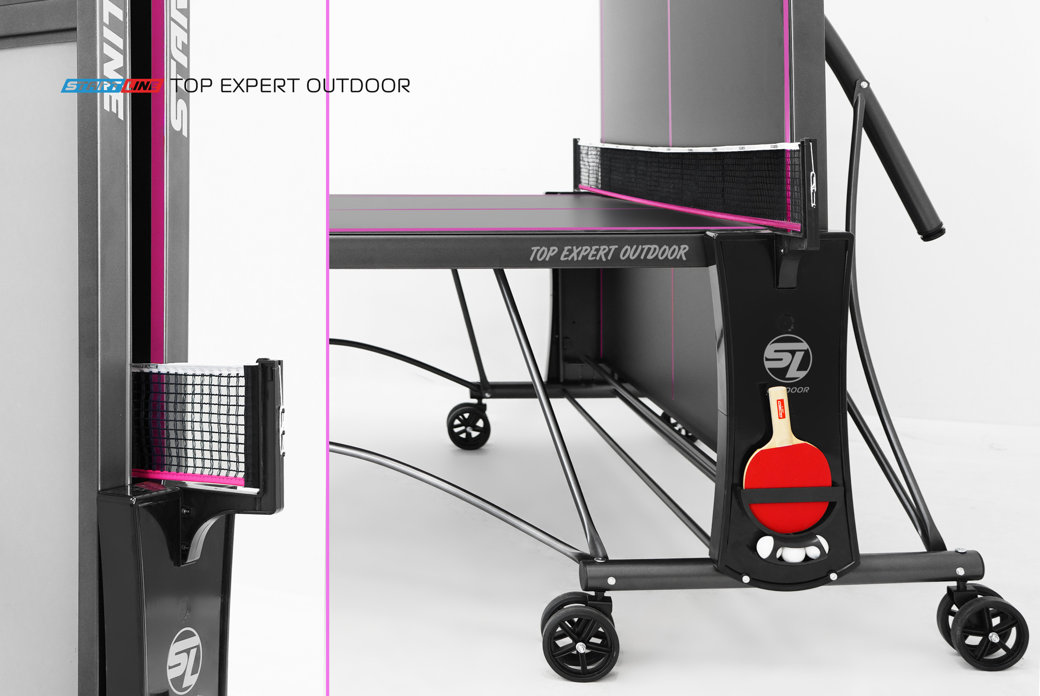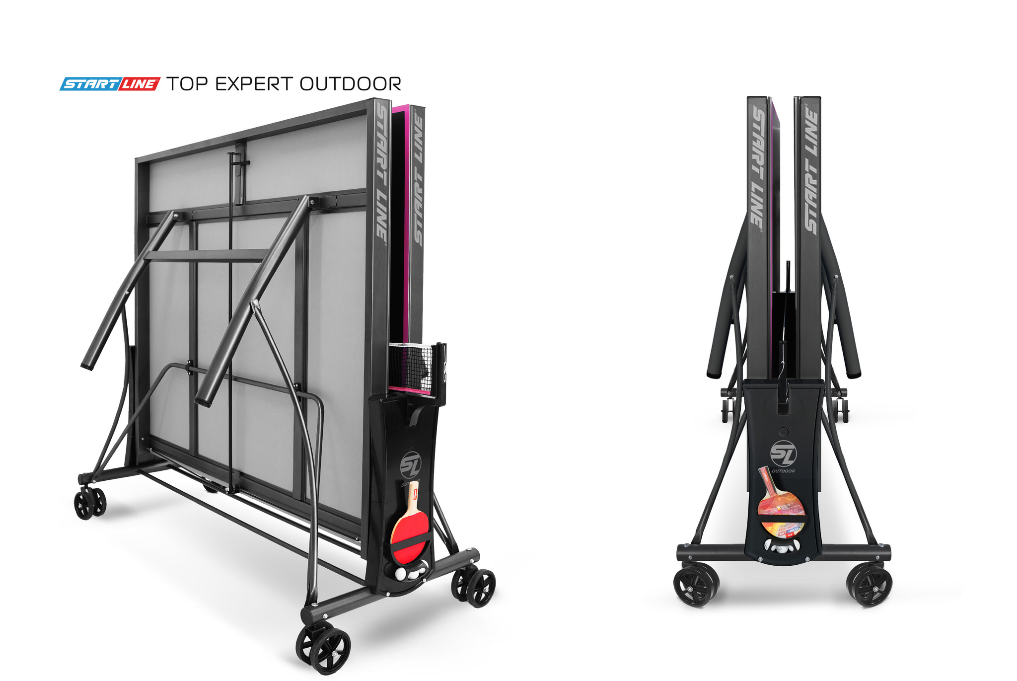TOP Expert 6 Всепогодный Black — стильная разработка конструкторского бюро Start Line выполнена с вниманием к мельчайшим деталям. TOP Expert 6 Всепогодный Black создан на основе популярной модели TOP Expert 6 Всепогодный, которая относится к любительскому уровню теннисных столов для игры на улице. Современные методы построения теннисного стола, позволили усовершенствовать дизайн. Обновленная модель TOP Expert 6 Всепогодный Black отличается уникальным сочетанием стильного черного цвета столешницы и контрастной фиолетовой разметки. Размер стола в рабочем положении: 274 см в длину, 152,5 см в ширину и 76 см в высоту, что соответствует стандарту ITTF. Стол укомплектован столешницей из прочной алюминиевой композитной панели. Толщина игрового поля 6 мм обеспечивает отличные показатели точности и контроля над мячом. Металлический кант шириной 60 мм защищает игровое поле от повреждений и продлевает срок службы теннисного стола. Поля столешницы обработаны фрезером по периметру, что предотвращает риск получения травм, гарантируя безопасность игроков. Алюминиевый слой столешницы из АКП 6 мм имеет толщину 0,3 мм. В отличие от конкурентов, у которых толщина алюминиевого слоя составляет всего 0,21 мм, Start Line гарантирует надежную защиту теннисных столов от коррозии и механических повреждений. Модель TOP Expert 6 Всепогодный Black оснащена двойными поворотными обрезиненными колесами диаметром 125 мм, что гарантируют плавное перемещение стола. Регулируемая высота боковых опор позволяет выставить идеальный уровень игрового поля даже на неровной поверхности. Механизм трансформации - собственная уникальная разработка Start Line, которая позволяет одному человеку легко сложить стол для хранения и быстро привести его в рабочее положение. Специальные фиксаторы надежно закрепляют положение стола как в разложенном, так и в сложенном виде. Конструкцией предусмотрен вариант трансформации стола для одиночной игры. Модель TOP Expert 6 Всепогодный Black укомплектована удобным держателем для ракеток и мячей с покрытием Soft-touch и встроенной сеткой, не требующей демонтажа при складывании. Начать игру можно в любое время, ведь все необходимое оборудование всегда под рукой.